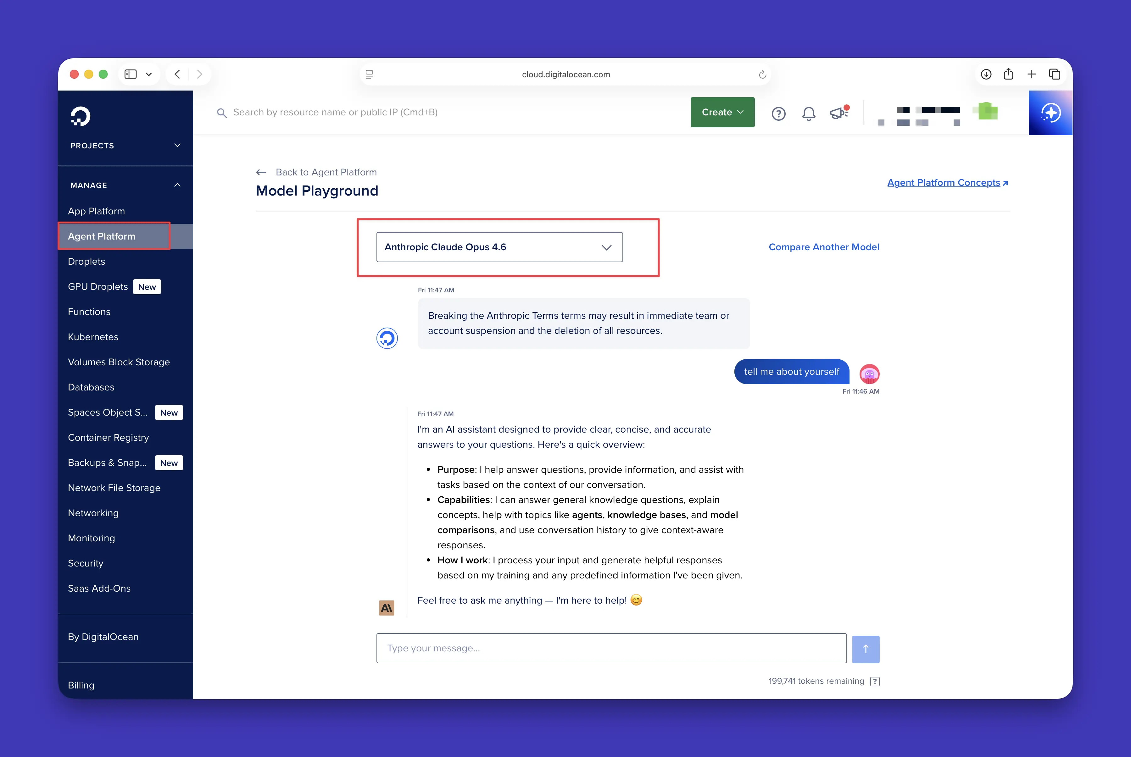 平台从一开始就内置了安全默认配置。Opus 4.6 在你的 DigitalOcean 项目(Project)内运行,采用安全的默认设置,随着工作负载规模扩大,可有效降低运维风险。