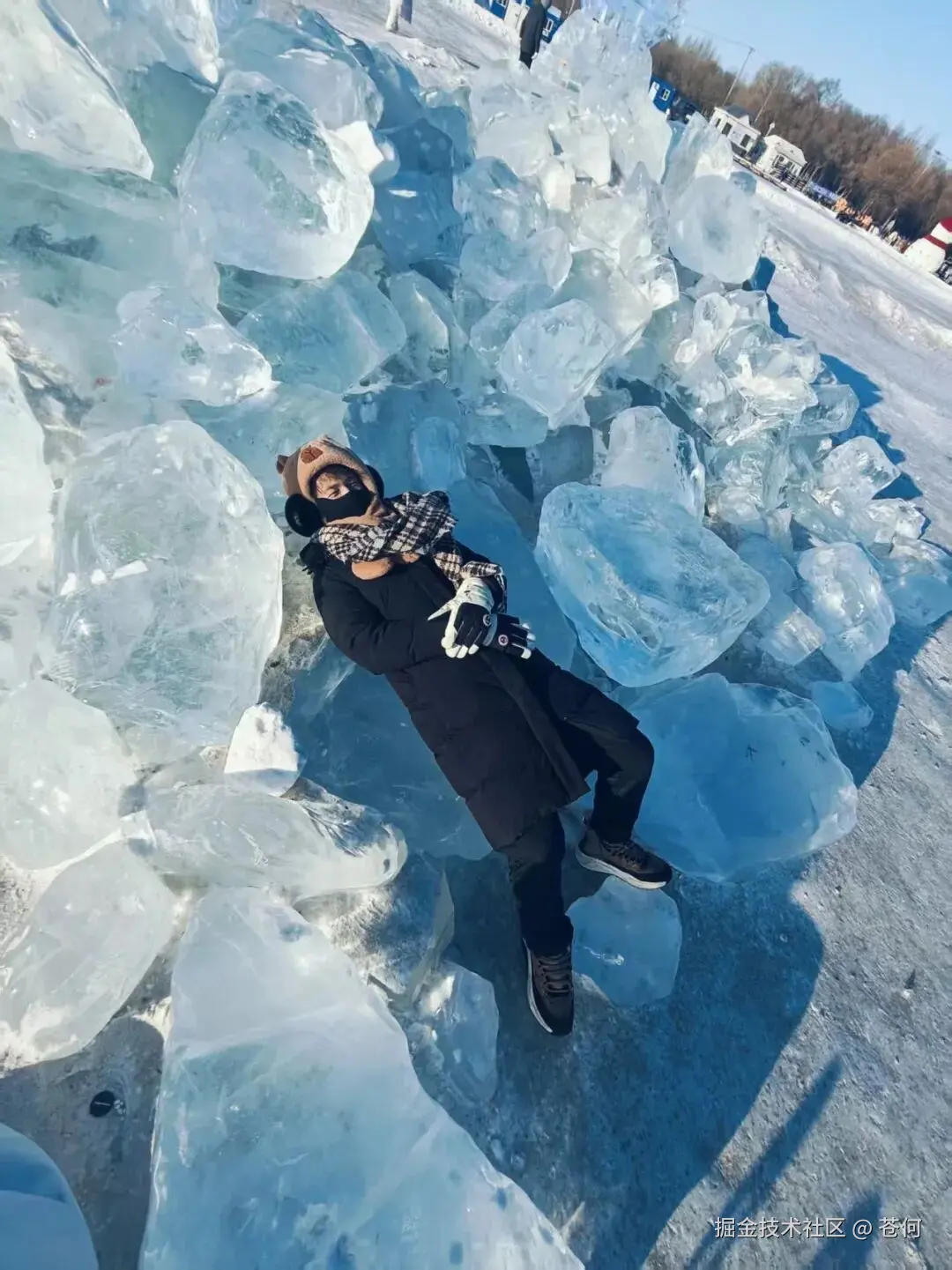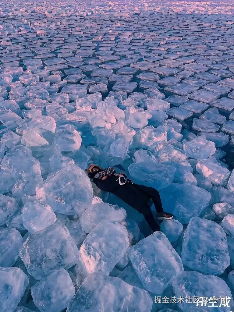 提示词:这张人躺在冰块堆中的照片,帮我把这张图转化为远景俯拍,在人物周围散落着成片的冰块,营造人躺在冰块群的感觉,黄昏中蓝调的砖石海的感觉