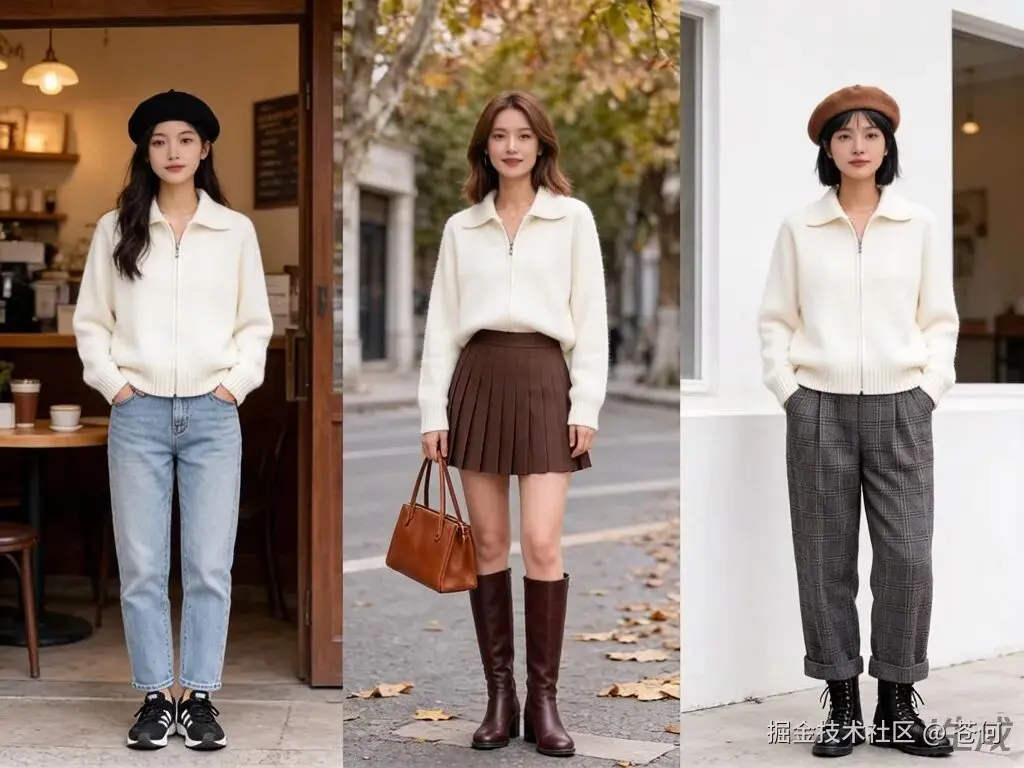 提示词:这件白色的毛衣,毛衣拉链拉下来一些可变成翻领毛衣,请帮我想三个穿搭方案,女生