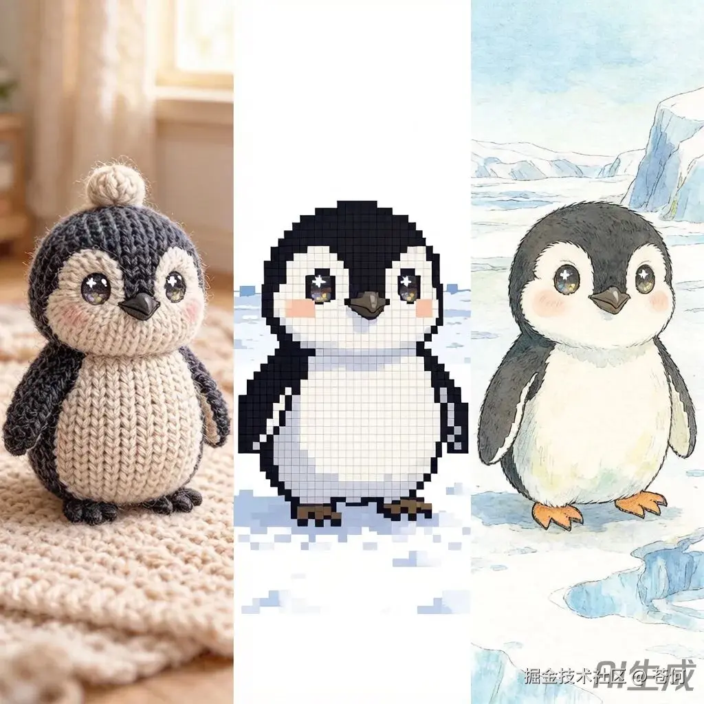 提示词:以这个萌萌的企鹅为原型,设计三个Q版的企鹅图像,分别为毛线风格、像素风格、吉普力风格