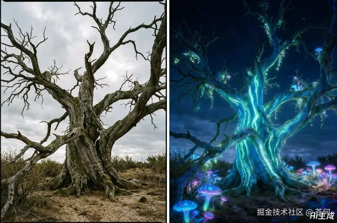 提示词:将这张张"白天拍摄的枯树"转变为"夜晚发光的阿凡达风格生命之树"