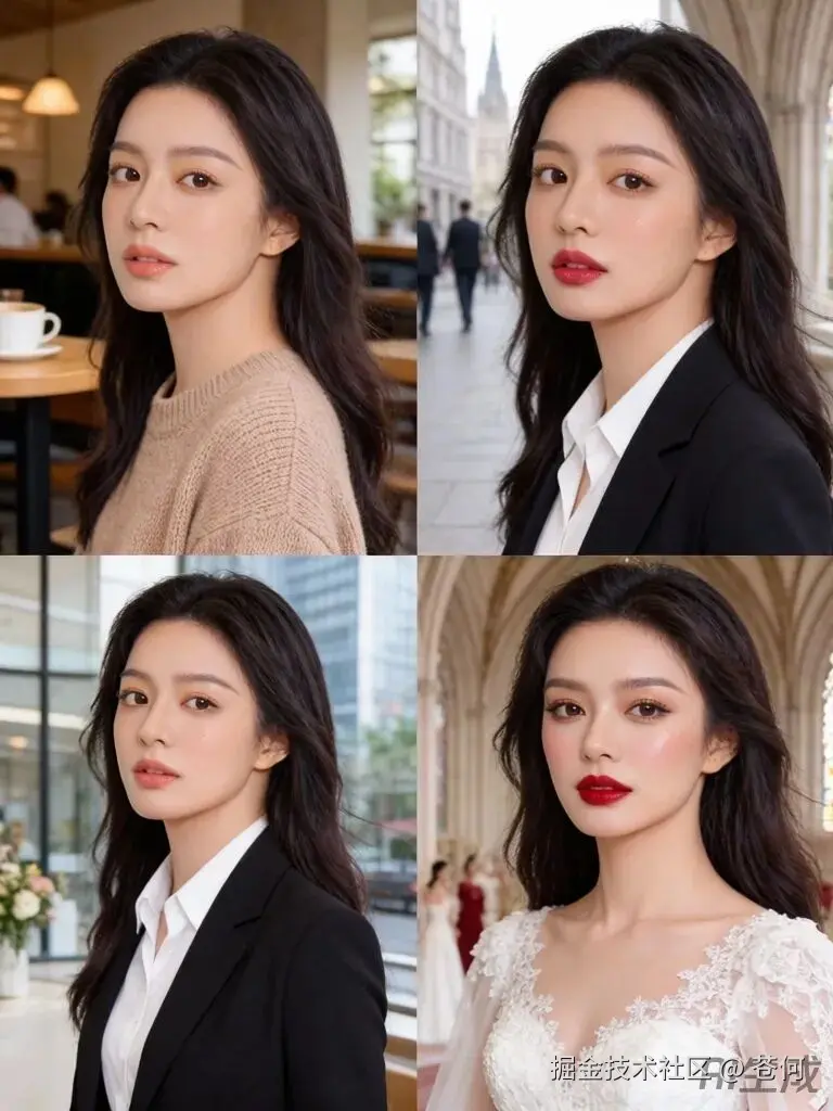 提示词:请给这个女生画上四种不同的妆容,并匹配相应的穿搭风格和环境