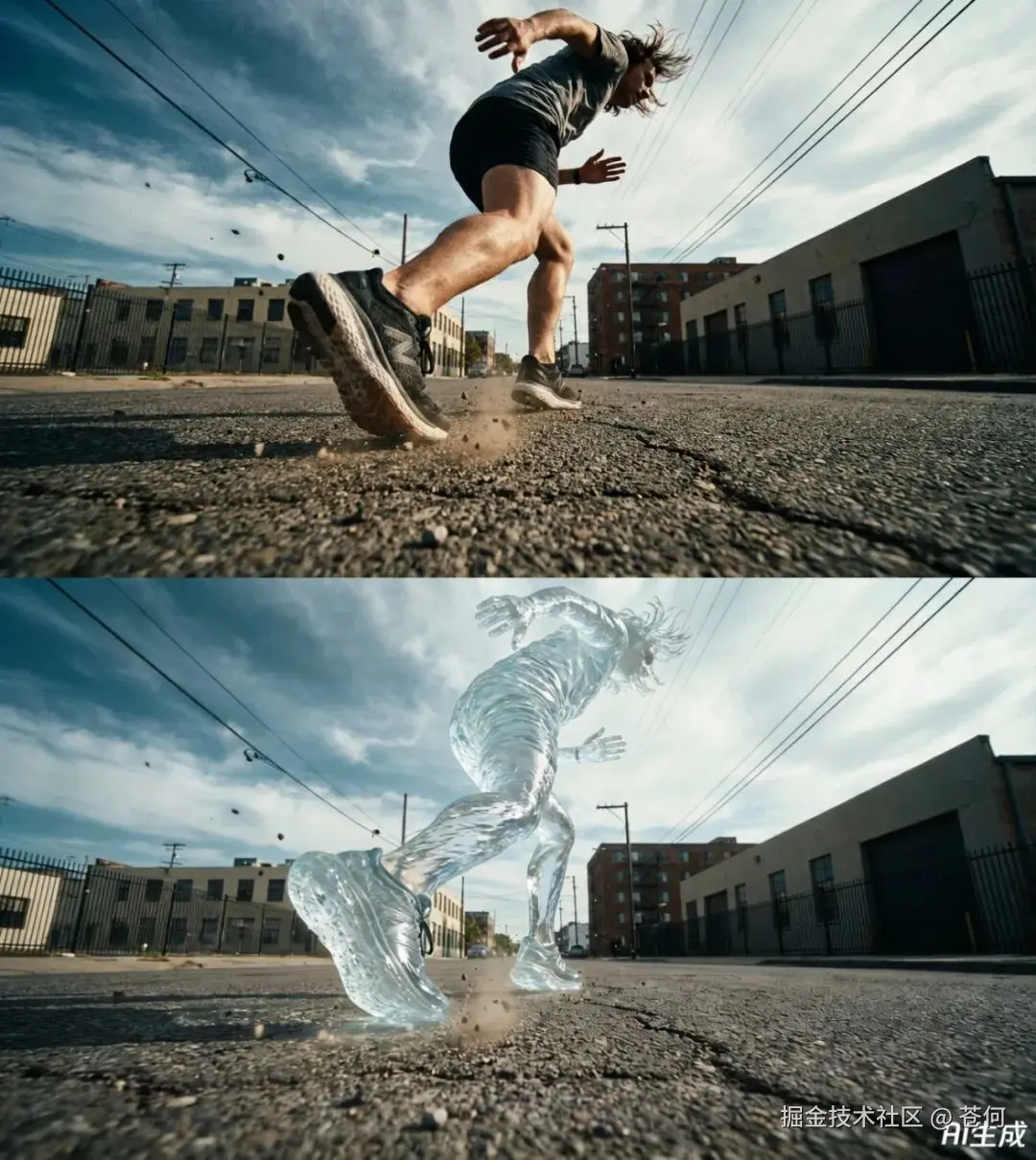 接下来继续给提示词:将奔跑的人转变为由流水组成的半透明人影
