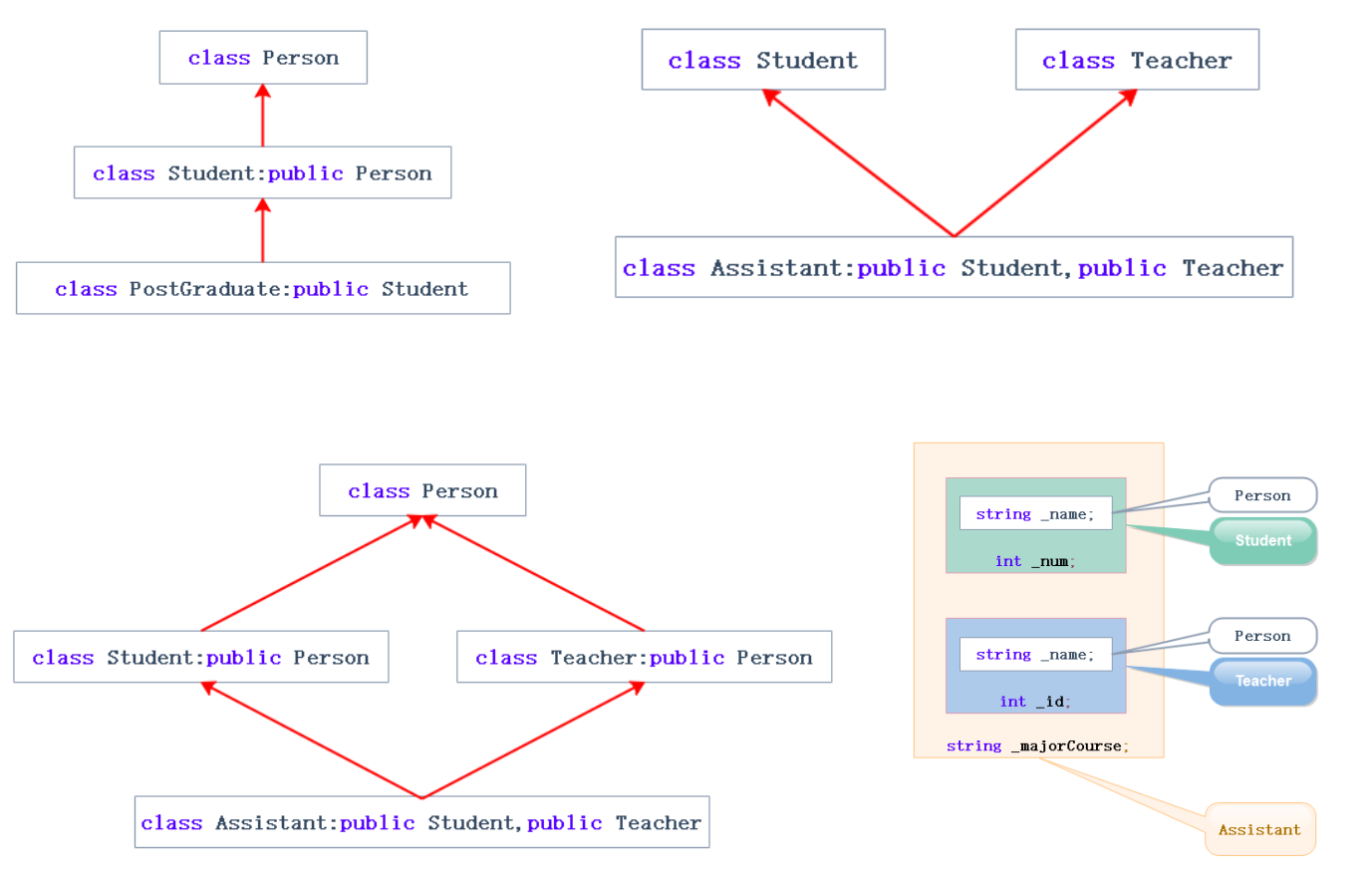 菱形继承:菱形继承是多继承的一种特殊情况。菱形继承的问题,从下面的对象成员模型构造,可以看出菱形继承有数据冗余和二义性的问题,在Assistant的对象中Person成员会有两份。支持多继承就一定会有菱形继承,像Java就直接不支持多继承,规避掉了这里的问题,所以实践中我们也是不建议设计出菱形继承这样的模型的。