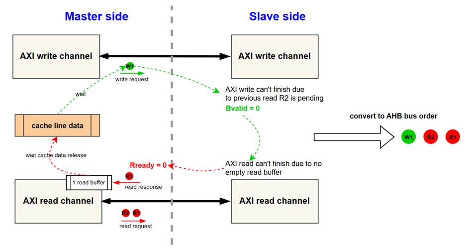 这样一个死锁环就形成了。Read buffer中的R1需要CPU cache腾出某set/way的空间->CPU cache在腾该set/way的写操作无法被slave接收->slave之所以不接收,是因为slave发现R2还没有做完->R2之所以没有做完,是因为CPU master无法接收R2的数据了->CPU master之所以无法接收新数据,是因为read buffer被R1占据了。