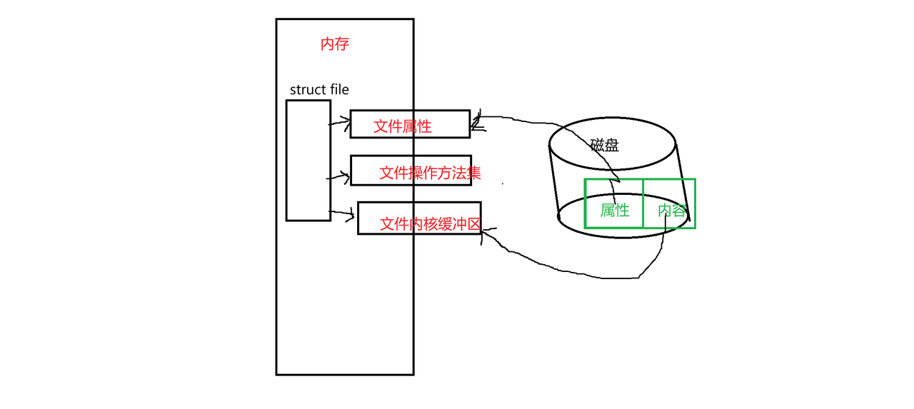 文件被打开后,OS会先创建这个文件的struct file结构体,然后在内存中再为这个文件创建三个空间,来存储这个文件的相关信息。文件属性,读写方法和文件内核缓冲区。如下图所示。