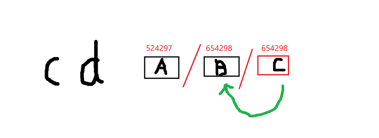 路径解析不是看文件名解析的,而是看文件的inode进行路径解析的。举个例子,当A目录里面--->有个子目录B,B目录里面有个硬链接C,C链接到B目录。当执行cd A/B/C,就会出现路径回环问题,死循环。如下图所示。