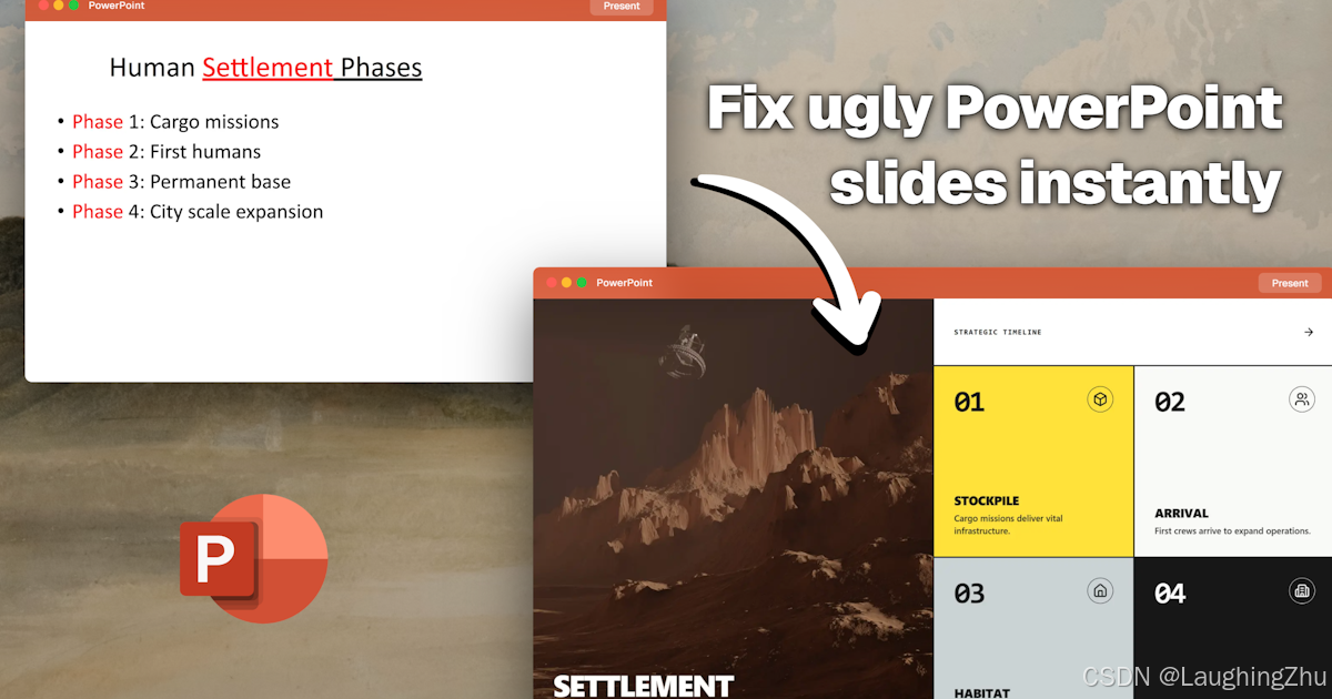 介绍:上传你的杂乱演示文稿。AI会为每一页重新设计,提供专业的布局、流畅的动画效果和与品牌相匹配的风格。导出后,你可以获得完全可编辑的PPTX、Google Slides或Keynote格式,随时继续编辑,永不停歇。