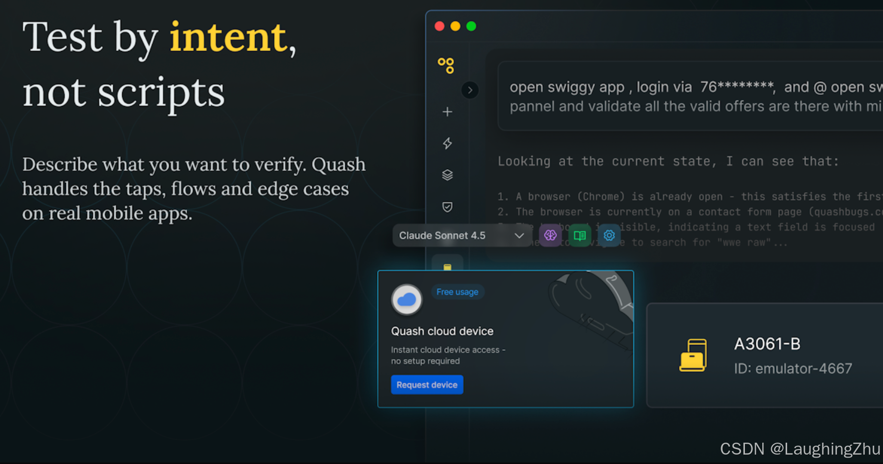 介绍:Quash是一款以意图为驱动的移动测试工具,允许您用简单的语言编写和运行测试,而不是用复杂的脚本。您可以在真实设备、云设备或本地模拟器上进行测试。Quash具备自动适应功能,当用户界面发生变化时,它能够自我修复,并且能够理解不同版本应用的行为。此外,它还支持后端验证、可重复使用的测试数据、测试套件以及并行运行测试。每次测试运行都会生成详细的执行报告,报告中包含分步骤的意图、操作和截图。