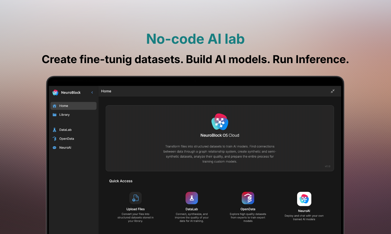介绍:我们建立了一个无需编码的人工智能实验室,让你能够使用自己的数据训练AI模型。NeuroBlock操作系统提供了一个完整的生态系统:生成和访问数据集、训练和部署模型,以及将它们下载到电脑、服务器或手机上,甚至通过我们的NeuroAI云推理框架运行,随时随地都能融入你的工作流程。拥有你自己的AI,成本低,性能完全按照你的需求定制。