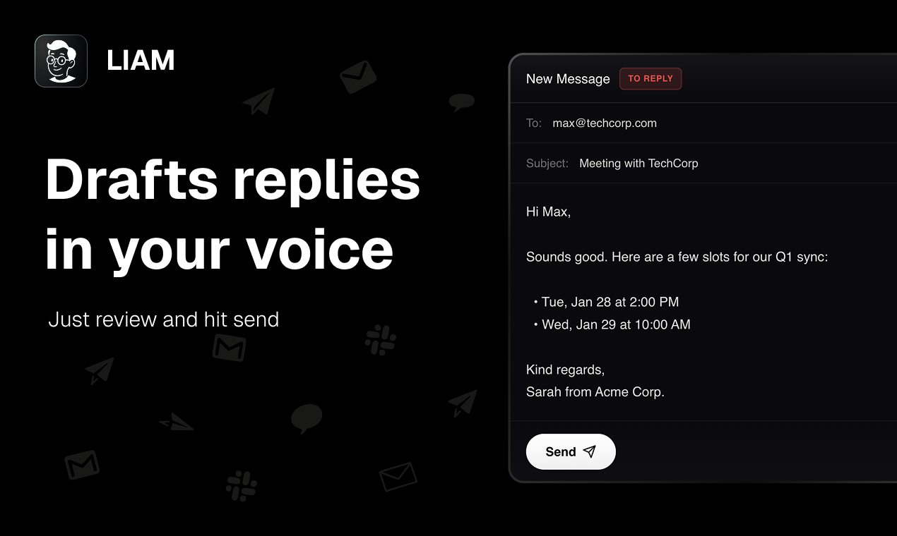关键词:LIAM, 邮件助手, 草稿生成, 行事历管理, 邮箱整理, 优先邮件, 日程安排, 高效办公, 即刻连接, 无需软件