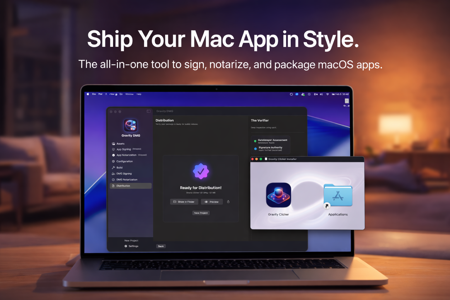 介绍:在几秒钟内创建美观的、经过认证的DMG文件。Gravity DMG 是一款一站式工具,可以优雅地签名、认证和打包macOS应用程序。告别那些复杂的命令行工具,比如notarytool和hdiutil。使用自动化工作流,你可以轻松完成以下操作: