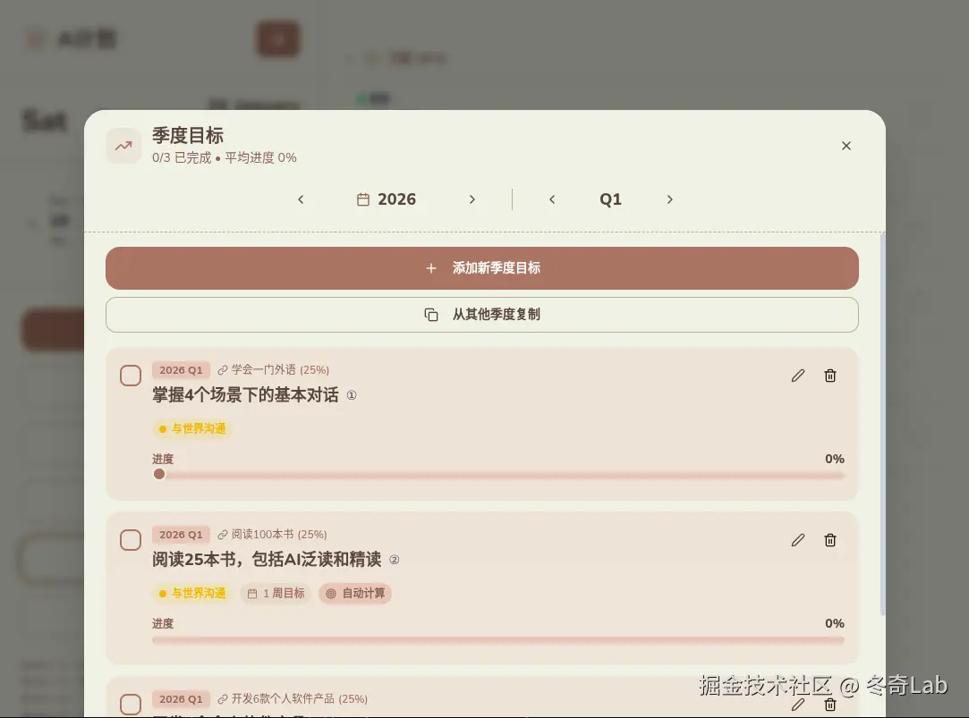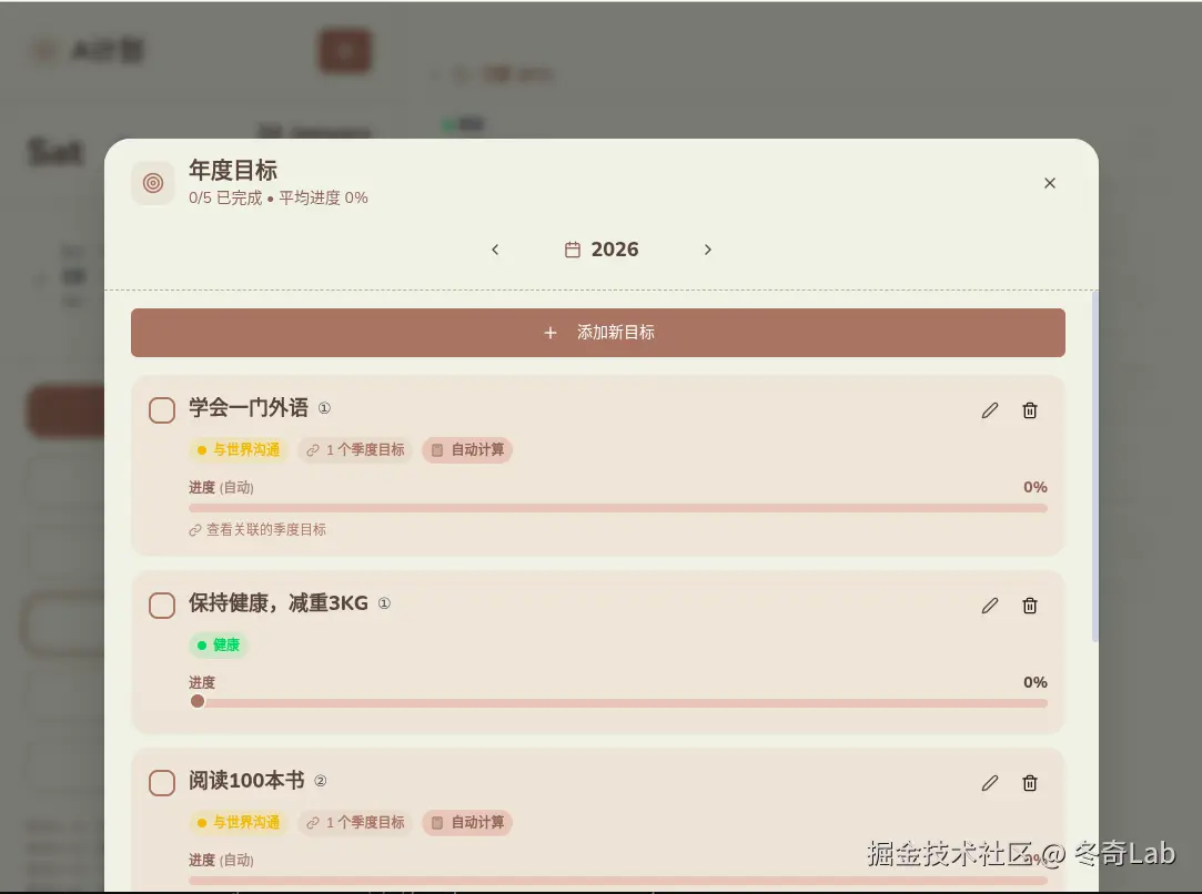 两个周末下来,目标管理、进度可视化、优先级排序、backlog功能全部上线了。总共花了大概24小时,其中大部分时间是AI在写代码,我在review和测试。