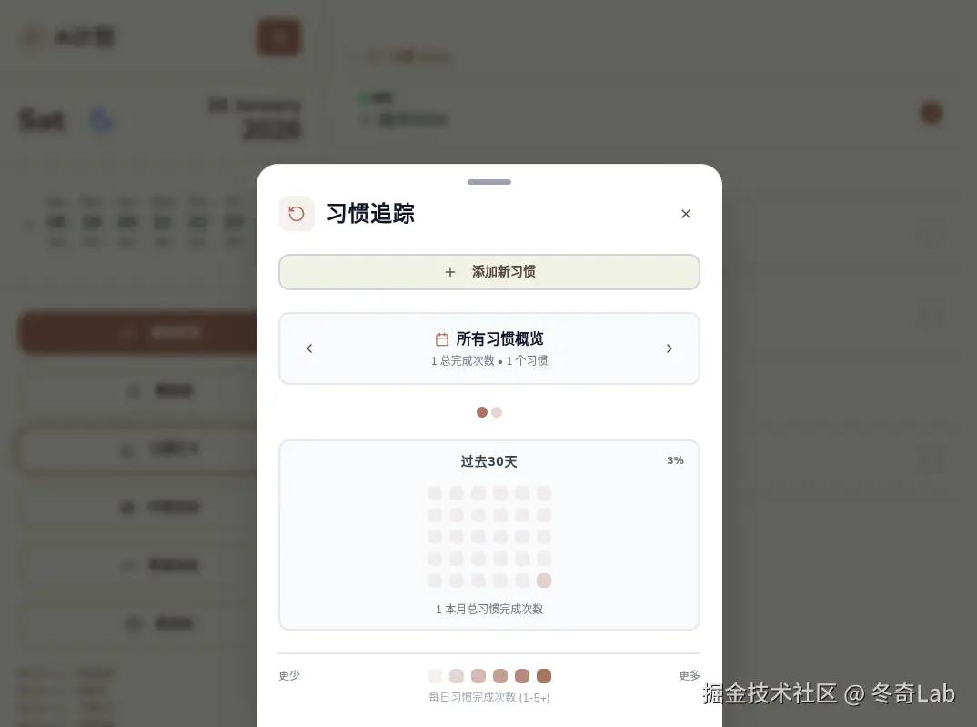 周期性要做的事还可以创建习惯,每天都会自动重复,不用手动去创建任务了。还能自动帮你统计过去30天习惯的执行情况,每次完成就是打卡。