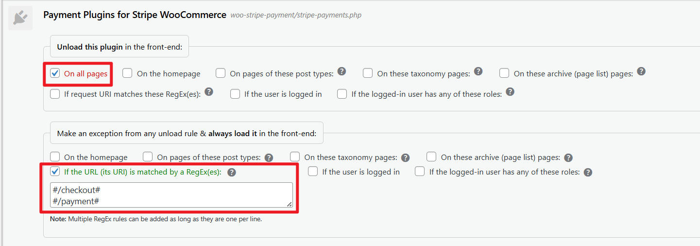 有的插件很影响速度,但是又不得不启用,例如Stripe的付款插件,只需要在woocommerce结账页面加载即可,此时你可以安装Asset CleanUp Pro(tb有pojie的),让插件只在特定页面加载,支持#作为通配符,同理你也可以让某些只在后台页面才需要使用的插件只在后台页面才加载,配合Code Profiler分析进行优化