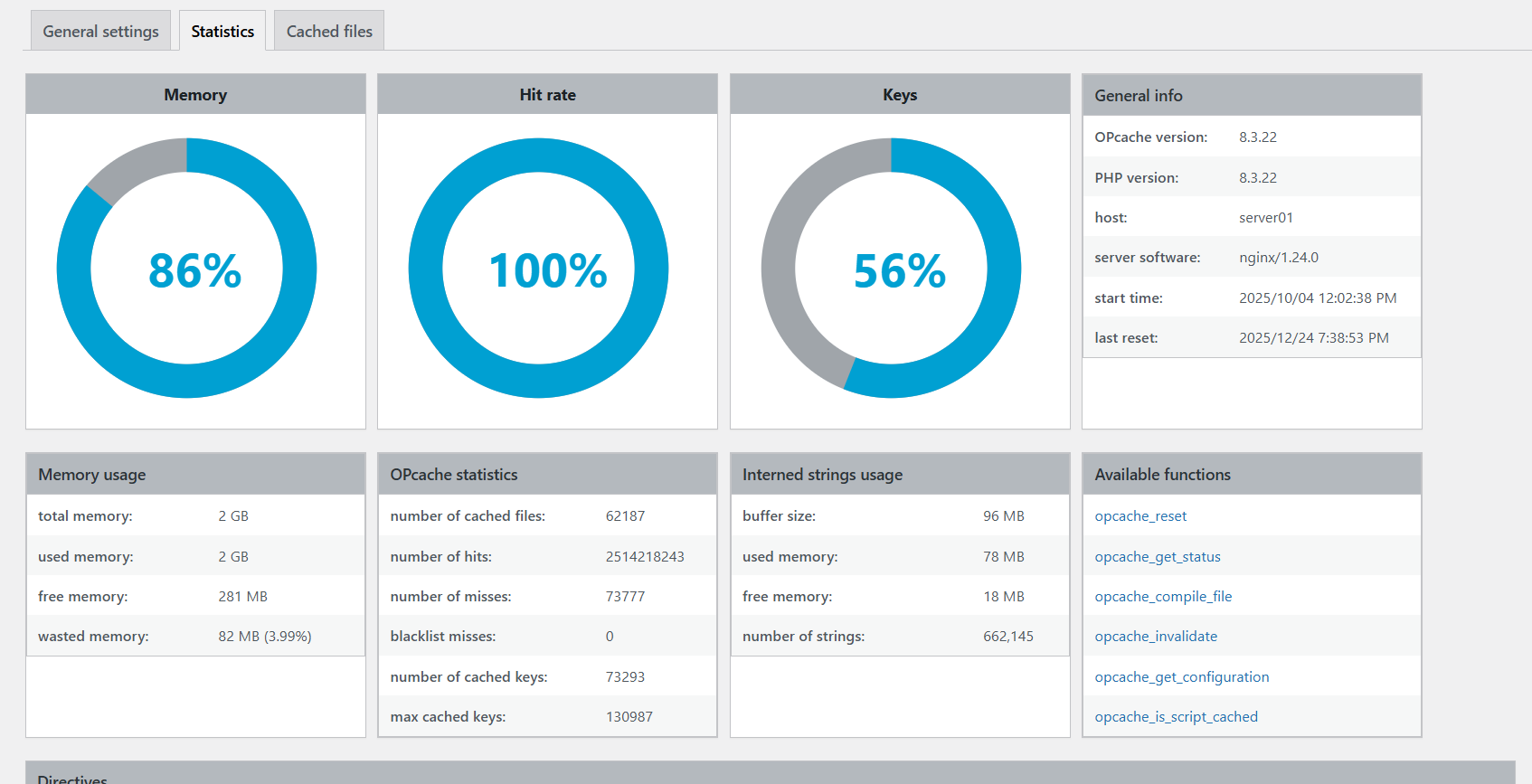 4、wordpress安装WP OPcache插件,持续观察数天memory,hit rate,keys的数值,确保memory和keys不超出100%,hit rate一定要到100%,如果达不到,请调整php配置文件中Opcache的参数。