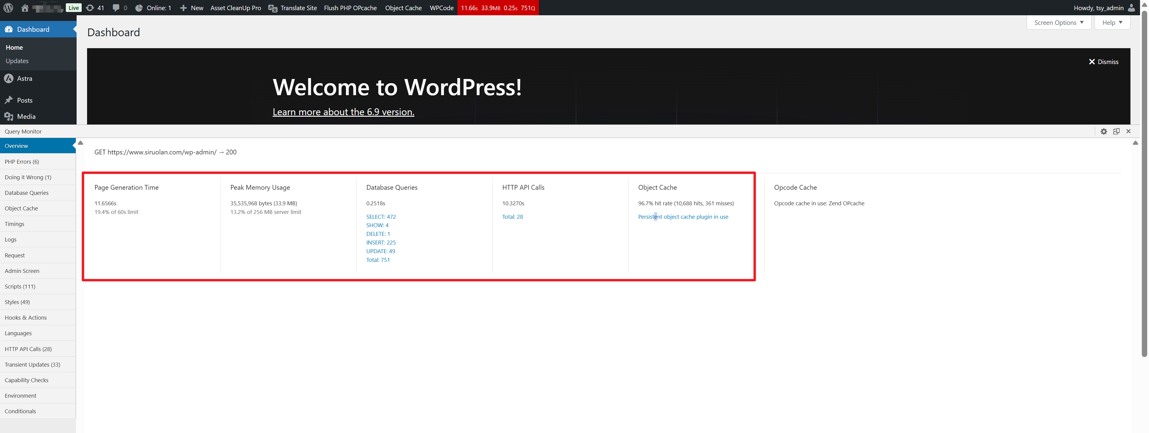安装Query Monitor插件,这个插件可以看得到页面加载时间,页面内存使用量,数据库查询时间和次数,HTTP API请求时间和数量。数据库查询一般可以靠redis插件降下来,次数越少越好,查询时间要尽量控制在0.3秒内,越短越好。HTTP API请求时间和数量是非常影响访问时间的一个指标,这些一般是页面的插件会发起一些api请求,例如插件自动检查更新等等,然后要优化的话就是具体情况具体分析和处理了