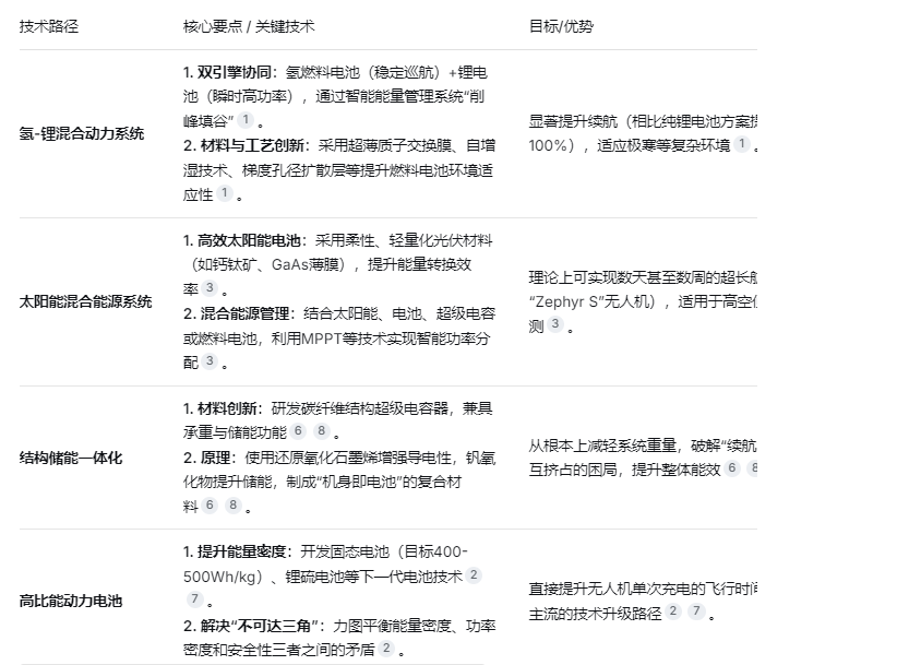 1.能源的"重量-能量"根本矛盾:所有机载能源和结构都会增加重量,消耗更多能量。这是无人机设计中最基本的矛盾,追求更高能量密度的动力电池、或采用结构储能一体化以"减重增效",都是试图从不同角度解决这一问题。