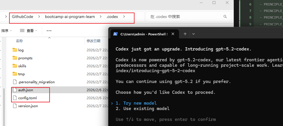 auth.json、config.toml复制到你设置的CODEX_HOME目录下