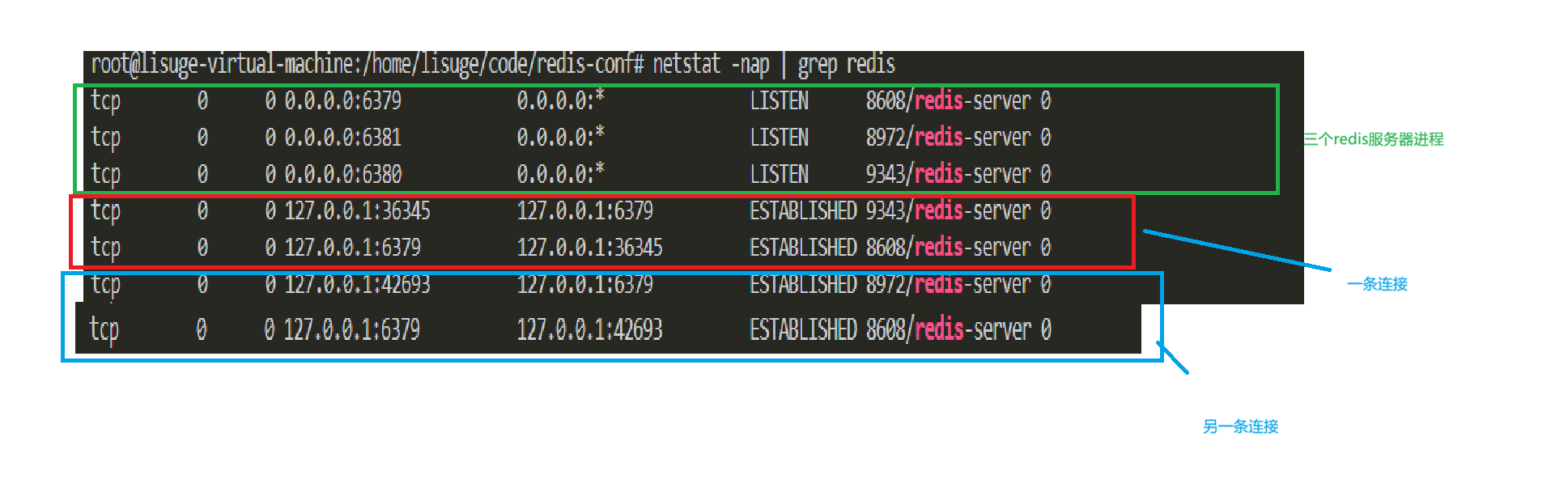 我们的所有的redis服务器都在一个主机上,发现果然有两条双向连接,至于端口号,我们知道,客户端的端口号是os随机分配的,因此我们就看到了上述端口号