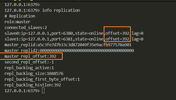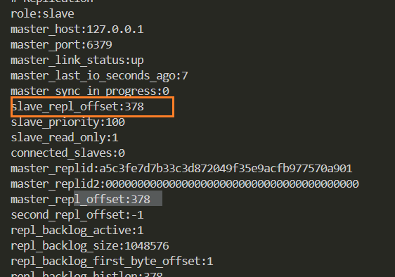 从节点(slave)每秒钟上报自身的复制偏移量给主节点,因此主节点也会保存从节点的复制偏移量。从节点在接受到主节点发送的命令后,也会累加记录⾃⾝的偏移量,统计信息在 info replication 中的 slave_repl_offset 指标中。