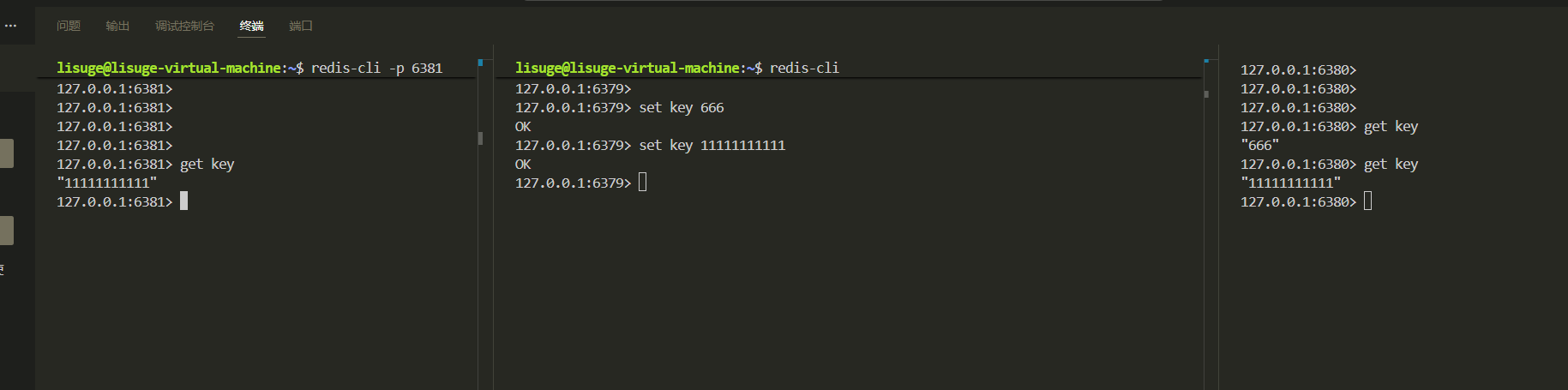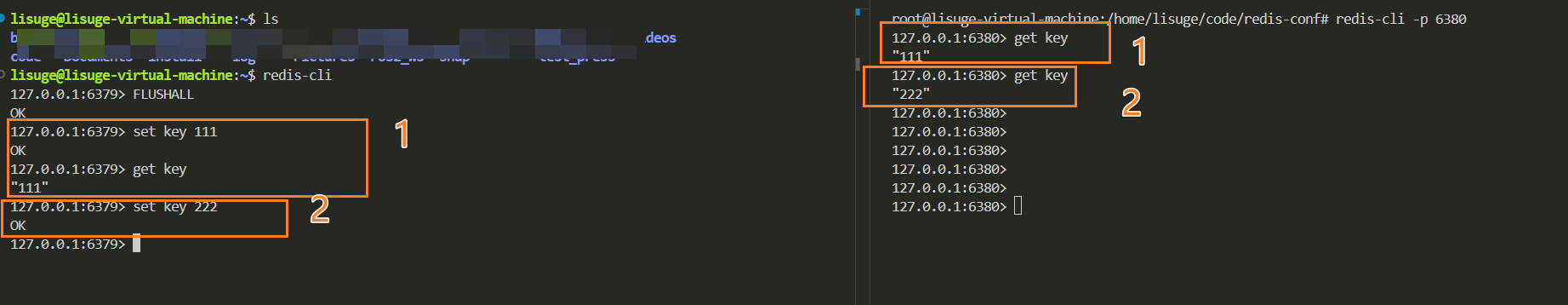 下面,我们分别以redis-server6379服务器,启动客户端1,以redis-server6380服务器,启动客户端2,看看是否会有数据同步的效果。
