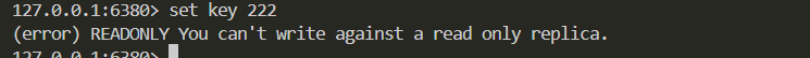 6380看起来好像是个主节点,仍然不是,还是个从节点 ,只是作为6381同步数据的来源,自身是仍然不能修改数据的。主从复制只能是主到从,不能是从-从,不然数据就乱了,主节点感知不到数据的变化。