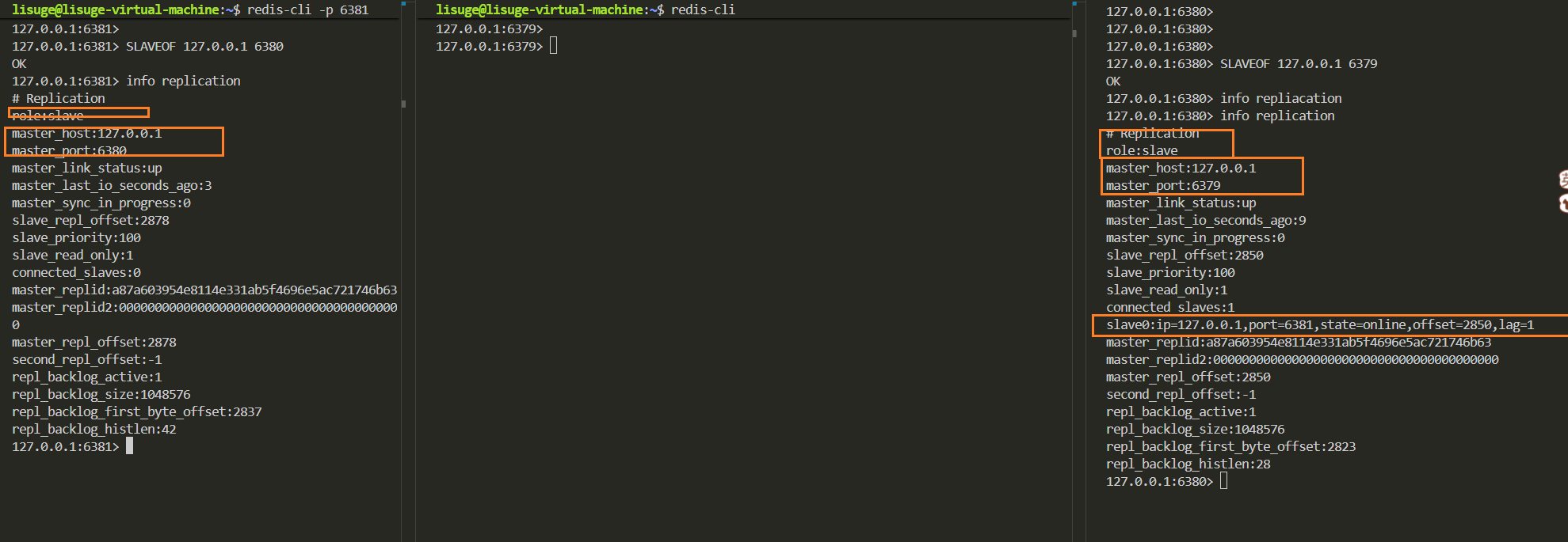 比如现在6380节点以6379为主节点,6381节点以6380为主节点,这样6379数据同步给6380,6380数据同步给6381.