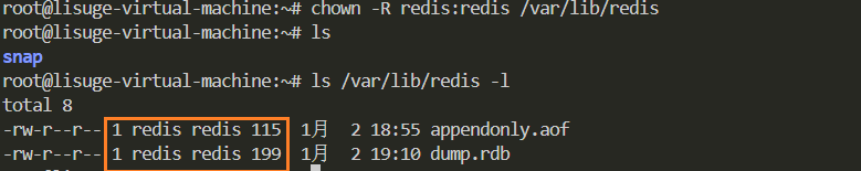 将 /var/lib/redis/ 目录及其所有内容的所有者和组都设置为 redis