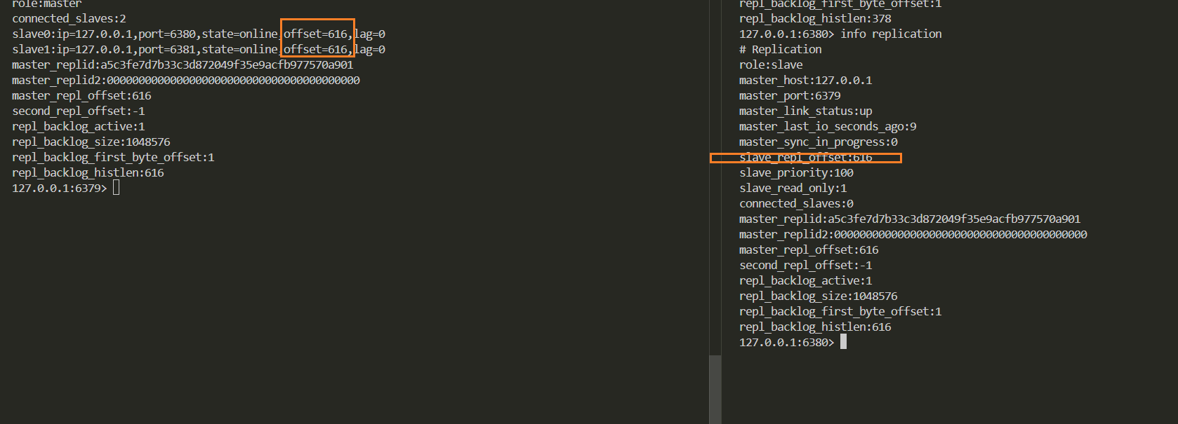 通过对⽐主从节点的复制偏移量,可以判断主从节点数据是否⼀致。即如果从节点和主节点的偏移量一样,那么就是"赶上直播了"。