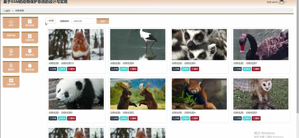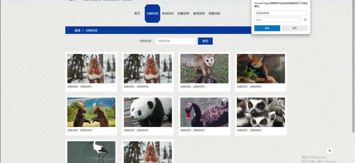 - 信息浏览:动物信息(搜索、查看详情)、新闻资讯(搜索、浏览)、招募信息(搜索、查看详情)、宣传信息(搜索、查看);