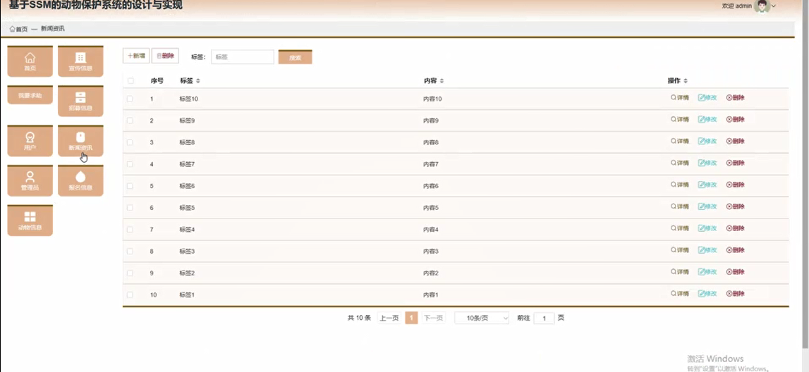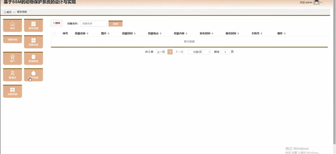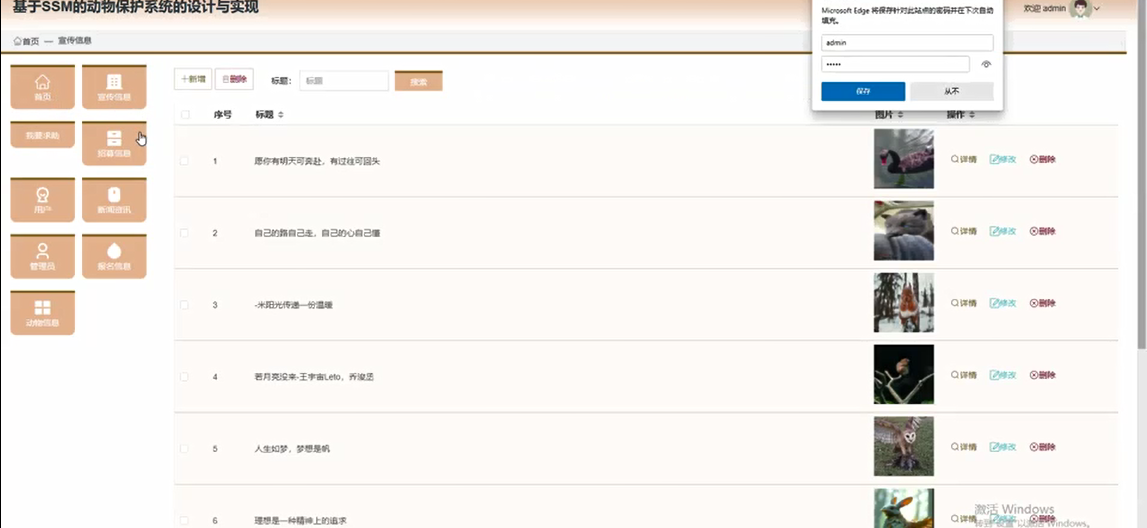 - 内容管理:动物信息、新闻资讯、招募信息、宣传信息的增删改查,招募信息发布;