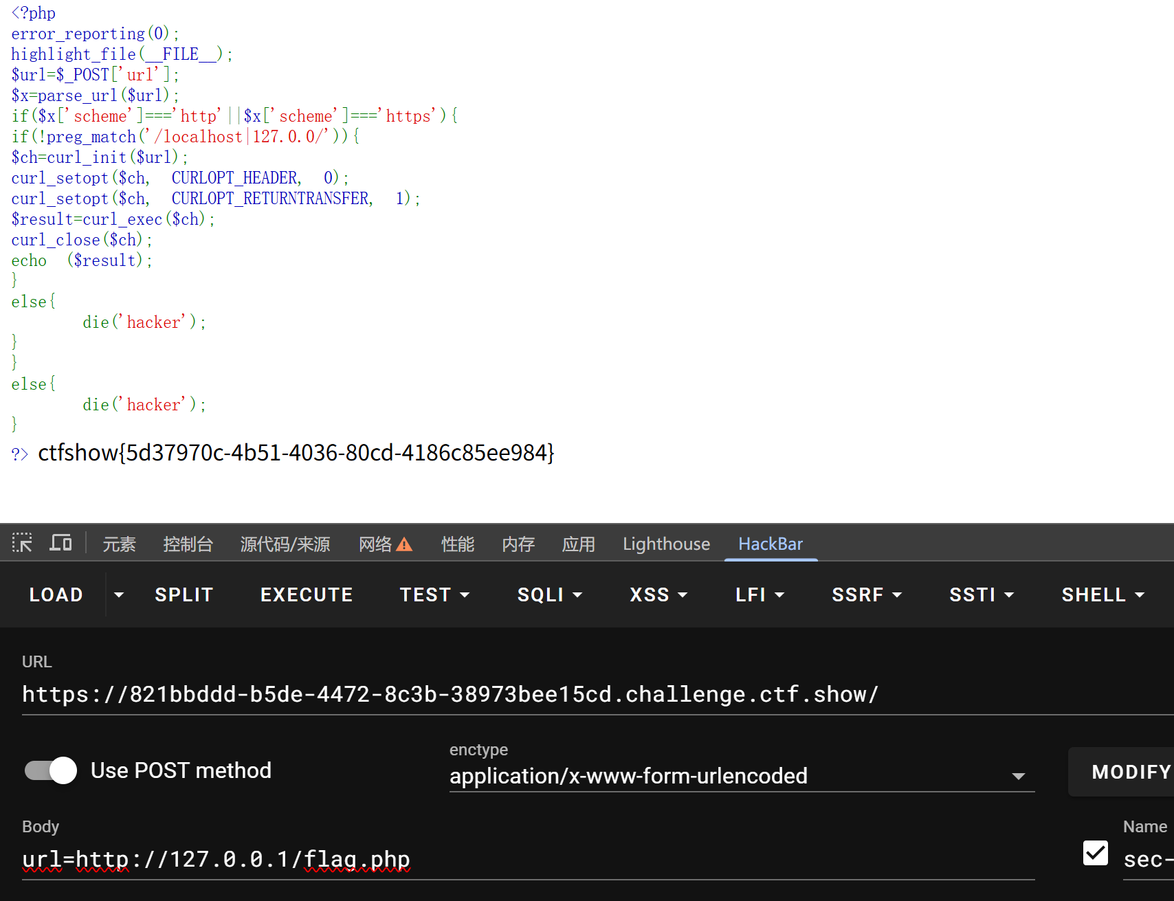 url=http://127.0.0.1/flag.php?show 这里show作为get传参返回null,不影响输出flag.php