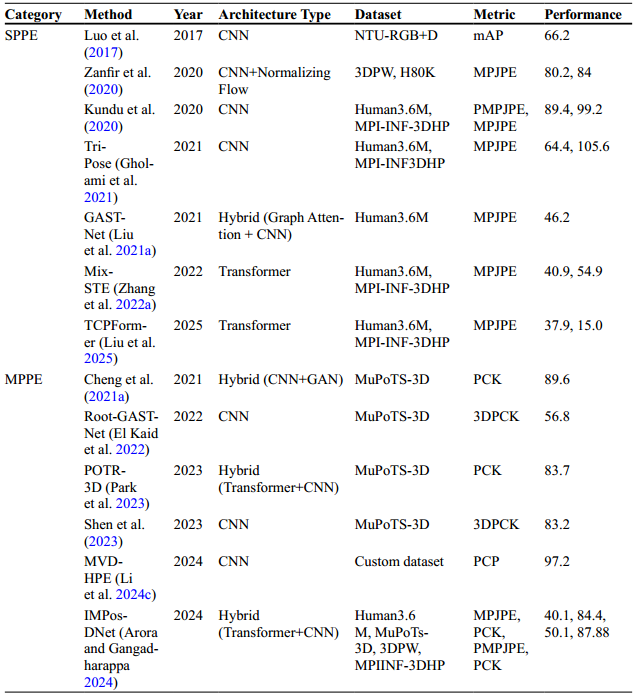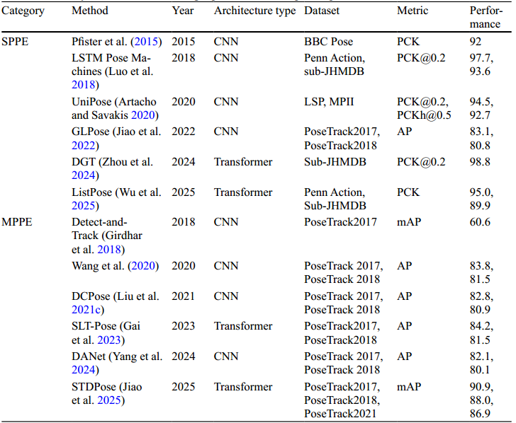 人体姿势估计(HPE)是计算机视觉中一个不断发展的领域,旨在从图像或视频等视觉数据中识别和定位不同的人体关节(也称为关键点)。 HPE 具有广泛的应用领域(例如,活动监控、人机交互、游戏、摄像头监控)。计算能力的显着进步和先进深度学习技术的发展促进了更准确、更有效的姿态估计系统的发展。随着研究的进展,HPE 正在从简单地检测个人姿势发展到了解和跟踪人们随时间的移动方式。这一发展凸显了对能够捕获复杂的实时人体运动以用于现实世界应用的系统的日益增长的需求。集成时空环境的 HPE 系统可帮助 HPE 系统识别和跟踪人体随时间的运动,从而实现更精确的理解。
