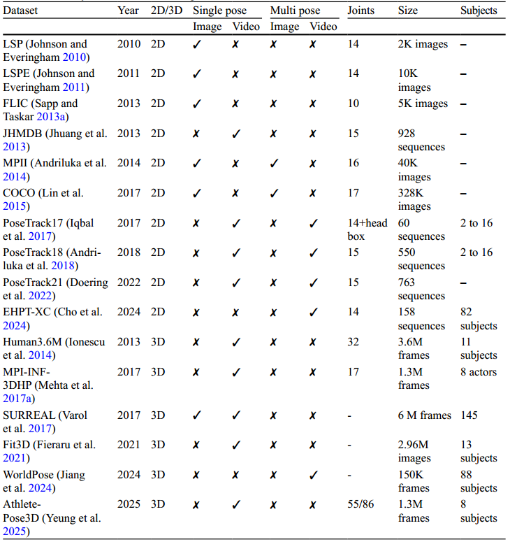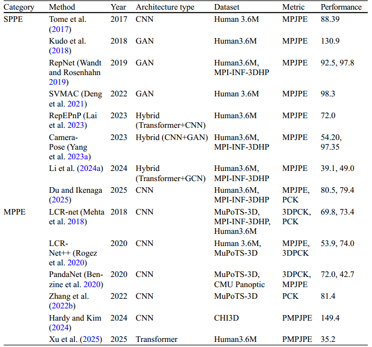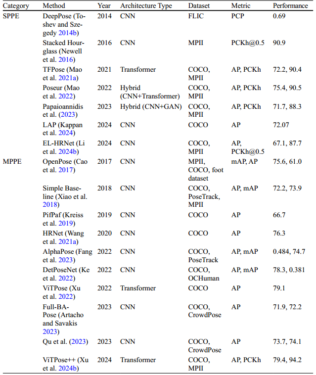 近年来发布了许多针对 HPE 的调查。目前大多数调查都集中在 2D HPE,有些只关注 3D HPE 方法。 Wang 等人 发表了关于基于深度学习的 3D HPE 方法的综合综述。但是,它不涵盖 2D HPE 方法。它还提供了几个数据集的详细信息。然而,范围仅限于 2018 年之前引入的 3D 姿态数据集。Chen 等人的另一项工作仅关注 2D HPE 方法,尽管它包括各种数据集,但缺乏对每个应用领域的比较分析。 Neupane 等人 提出了一项关于 3D HPE 方法深度学习的调查,其中讨论了不同的方法,包括基于 Transformer 和扩散的最新方法。