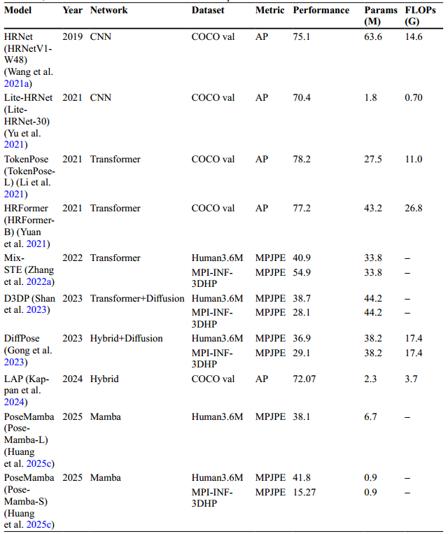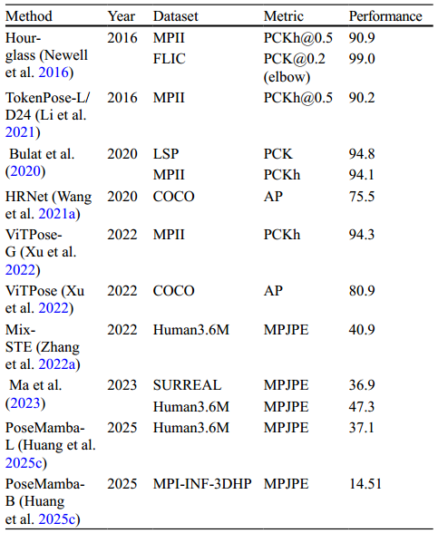 尽管取得了所有这些进步,准确性与效率的权衡仍然是一个悬而未决的问题。未来的研究应侧重于结合高效架构的统一优化策略,以提高 HPE 系统的效率。最近,基于 SSM 的架构(例如 Mamba)已成为 Transformer 的有效替代方案,具有减少的内存使用量和强大的表示学习功能。展望未来,此类架构为推进实时 HPE 系统提供了引人注目的方向。