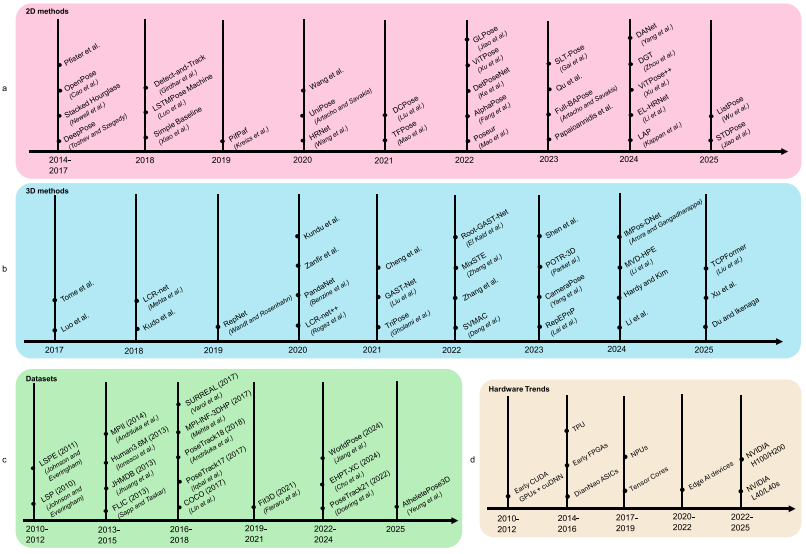 图 3 2010 年至 2025 年 HPE 的里程碑和硬件趋势。a 2D 方法,b 3D 方法,c 数据集,d 硬件趋势