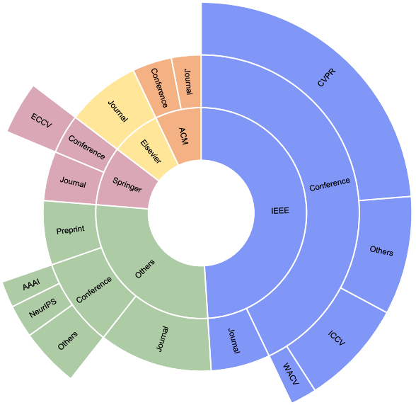 最终选择的论文包括 196 篇论文,这些论文经过精心挑选,以平衡方法论的进步并与研究重点相关。图 1 显示了用于本研究的期刊和会议的百分比。