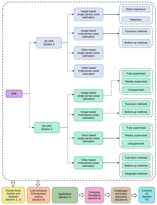 本文的其余部分组织如下:图 2 讨论了 HPE 中使用的各种数据集。第 3 节探讨不同的人体模型。第 4 节深入研究了 Sects 的 2D 姿态估计。 4.1 和 4.2 重点关注基于 2D 图像的方法和门派。 4.3 和 4.4 关于基于视频的方法。第 5 节讨论 3D 姿态估计,其中 Sects. 5.1 和 5.2 涵盖了基于图像的方法,随后是 Sects。 5.3 和 5.4 讨论基于视频的方法。第 6 节解释了 HPE 训练和评估中常用的损失函数和评估指标。第 7 节讨论 HPE 在各个领域的应用。第 8 节讨论 HPE 中的新兴范例。第 9 节讨论了 HPE 面临的挑战和未来的研究方向。最后,第四节总结了主要结论。 10.图 2 展示了本次调查中使用的方法和途径的分类。图 3 所示的时间线总结了本次调查中讨论的 2D 和 3D HPE 使用的里程碑和数据集,时间跨度为 2010 年至 2025 年。