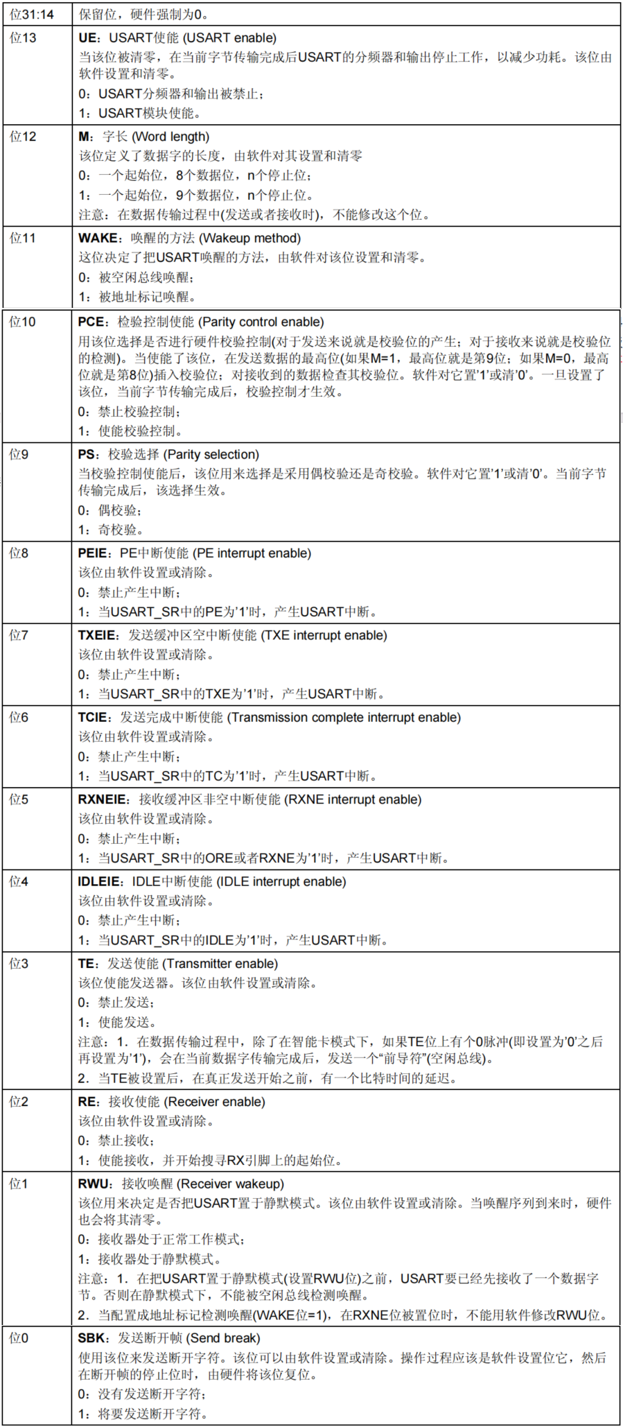 在USART_CR1中,常用的控制位有: