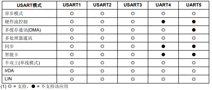 STM32F103ZE系列中有5个串口,其支持的功能统计如下: