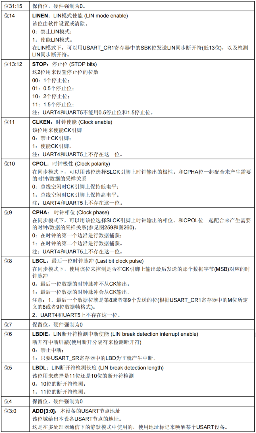 在USART_CR2中,常用的控制位有:STOP