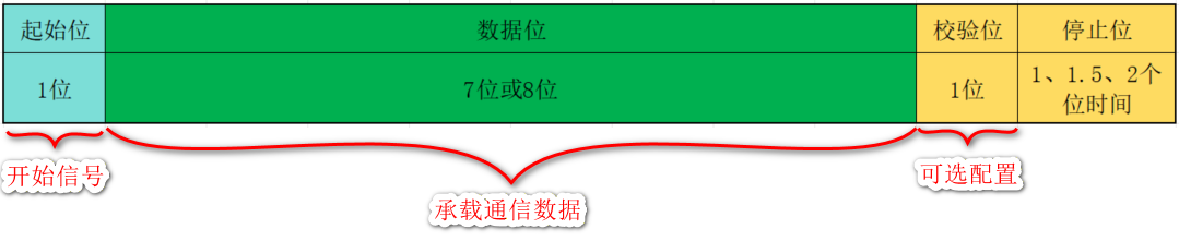 一帧数据主要有起始位、数据位、校验位、停止位组成,其中起始位、数据位、停止位是必选项,校验位是可选项。数据帧可以参考下图: