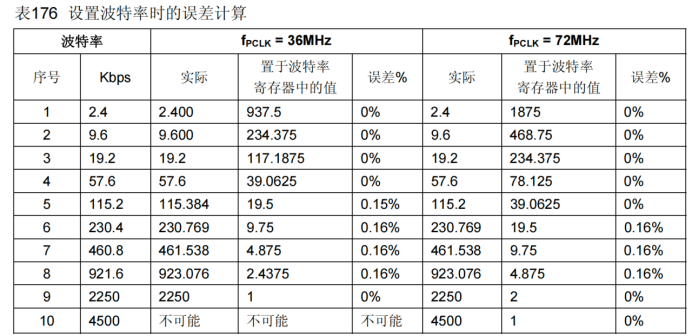 假设时钟频率为72MHz,波特率的计算公式如下: