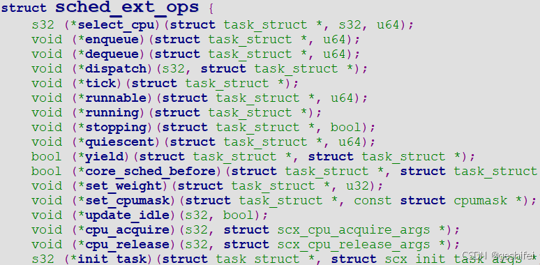struct sched_ext_ops代表了一个调度器,里面定义了很多回调函数,本文分析select_cpu这个hook,sched ext的部分hook如下: