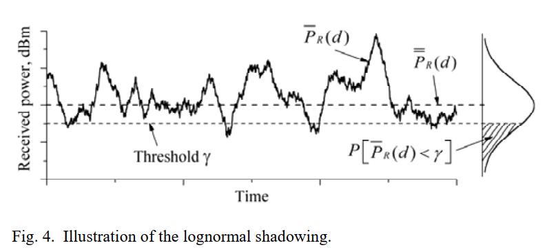 图 4 右侧画的是 dB 域高斯概率密度:横轴是功率,中心在 PR(d)‾\overline{P_R(d)}PR(d),散布由 σ\sigmaσ 决定。这样就能算出 Pr{PR(d)>γ}\Pr\{P_R(d)>\gamma\}Pr{PR(d)>γ} 或 Pr{PR(d)<γ}\Pr\{P_R(d)<\gamma\}Pr{PR(d)<γ}。整个图像表达的是:对数距离模型未必能预测某个具体点的功率,但它能给出"统计置信度"。