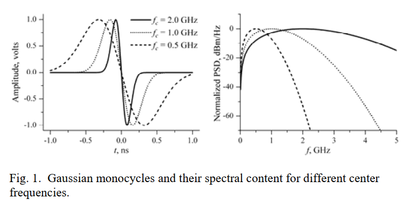 原文在 II‑A 里说:高斯脉冲易生成,因此常用;当把高斯脉冲加到理想发射天线 上时,由于天线的"导数行为"(derivative behavior),辐射电场中出现的会是高斯脉冲的导数,这就是经典的 Gaussian monocycle。论文把这个单周期直接写成(式 (1)):