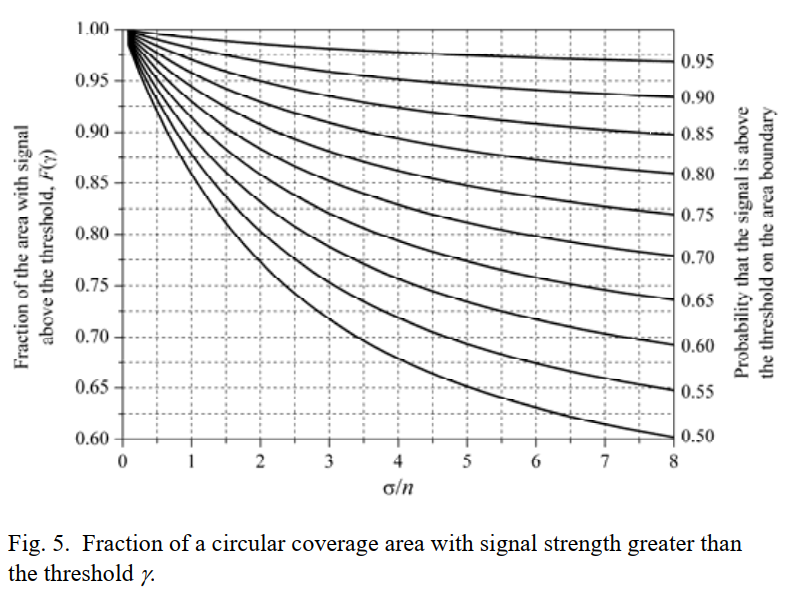 其中横轴是 σ/n\sigma/nσ/n,右侧纵轴是圆周边界处"超过门限"的概率(也就是 Pr{PR(d)>γ}\Pr\{P_R(d)>\gamma\}Pr{PR(d)>γ}),左侧纵轴是圆盘内的"面积比例"。图里一组曲线从 0.95、0.90...一直往下标注,代表不同的边界点概率。可以按原文描述的用法:先算 σ/n\sigma/nσ/n,再找到对应边界概率曲线,往左读出面积比例。