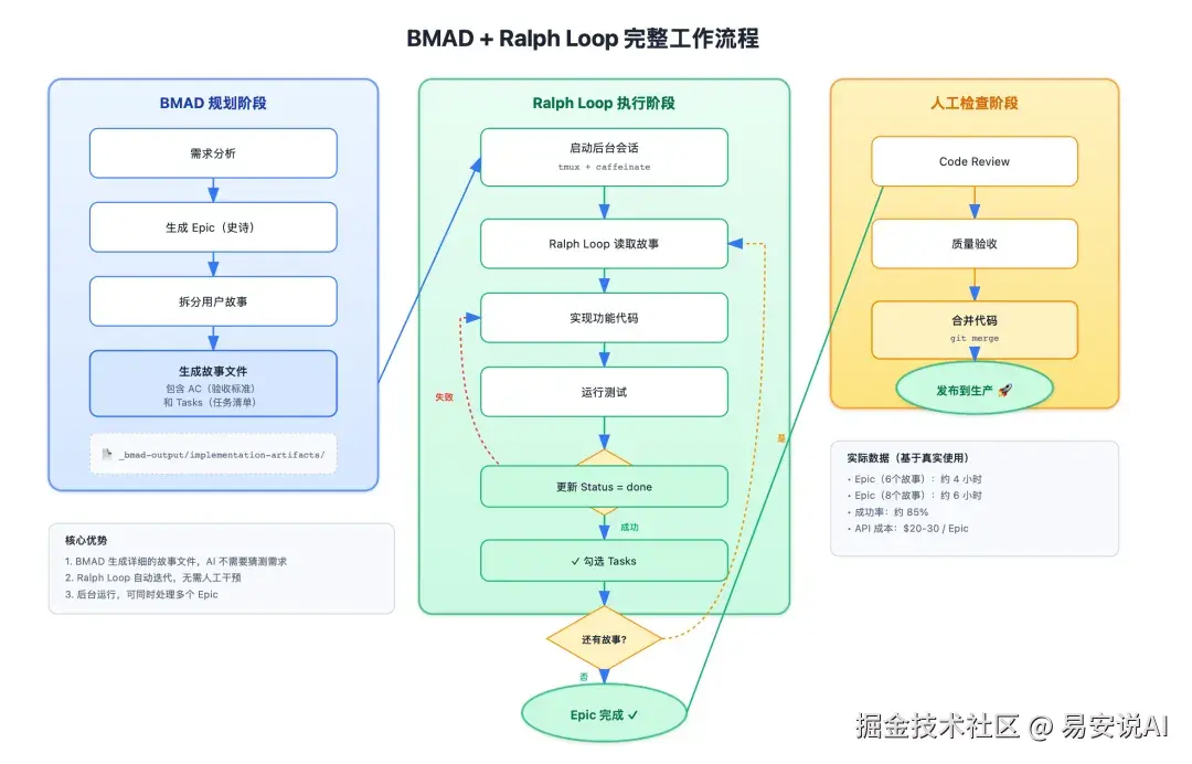 Ralph Loop 接手执行。它在后台跑,读取故事文件,实现功能,跑测试,发现问题自动修复,完成一个勾选一个,自动处理整个 Epic。这个阶段完全不需要人盯着。