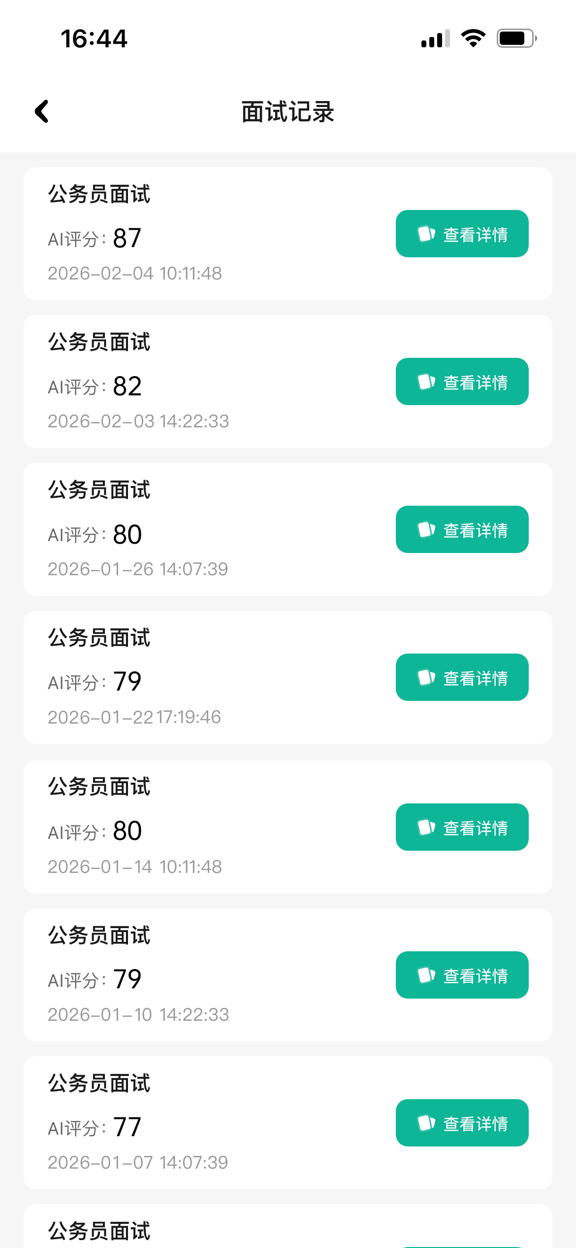 * **独家功能**:拥有各省市历年面试真题库(公务员、事业单位、军队文职),并提供**AI 示范作答**,解决"张不开嘴"的难题。